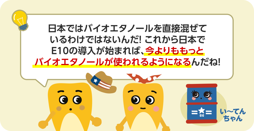 現在、日本ではガソリンに、バイオエタノールがETBE(エチル・ターシャリー・ブチル・エーテル)という物質に変換されて入っています。エタノールの量にして82万kLで、混合率は約1.9%です。