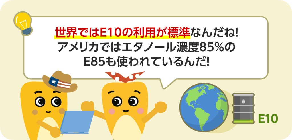 世界ではE10が標準となっています。アメリカはE10、E15、E85が使用でき、カナダはE10,ブラジルはE27、ヨーロッパはE10、フランスはE10とE85です。電気自動車に熱心だったイギリスも、4年前からE10を義務化しています。アジアではインドやタイやフィリピンがE10からE20を目指しています。中国も州にもよりますが、E5とE10が普及している状況です。すべて、ETBEではなくエタノールが直接混合されていますが、特段の問題や支障はありません。