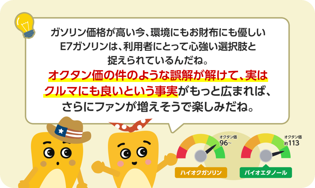 例えば、先日は「E7ガソリンはオクタン価が下がる」と言うコメントがありましたが、実は全く逆で、バイオエタノールはオクタン価が上昇し自動車に良い性能影響をもたらします。こうした事例を受けて、これからはさらなる情報発信に努めていきたいと考えています。