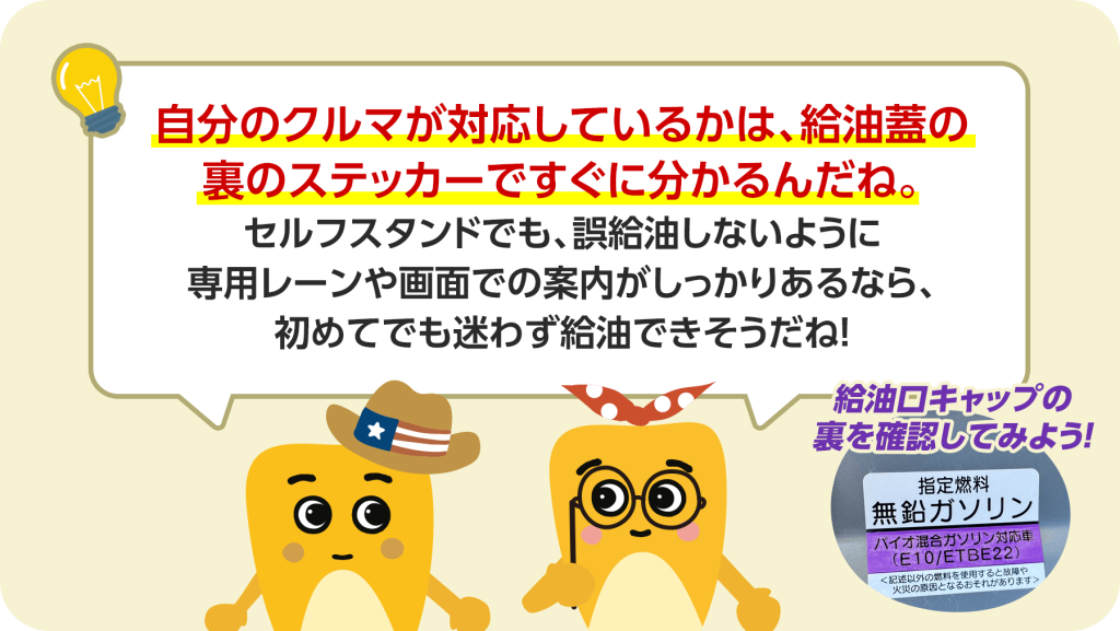 まず先ほど申し上げました通り、E7ガソリンの場合はご自身の車がE7を給油できるかどうか確認をしてください。確認方法は簡単です。具体的には燃料給油蓋の裏側に「バイオガソリン(E10/ETBE22)対応車」とステッカーが貼ってあるかを確認していただき、このE10という記載があれば、ご自身の車はエタノール10%まで混合したガソリンが利用できます